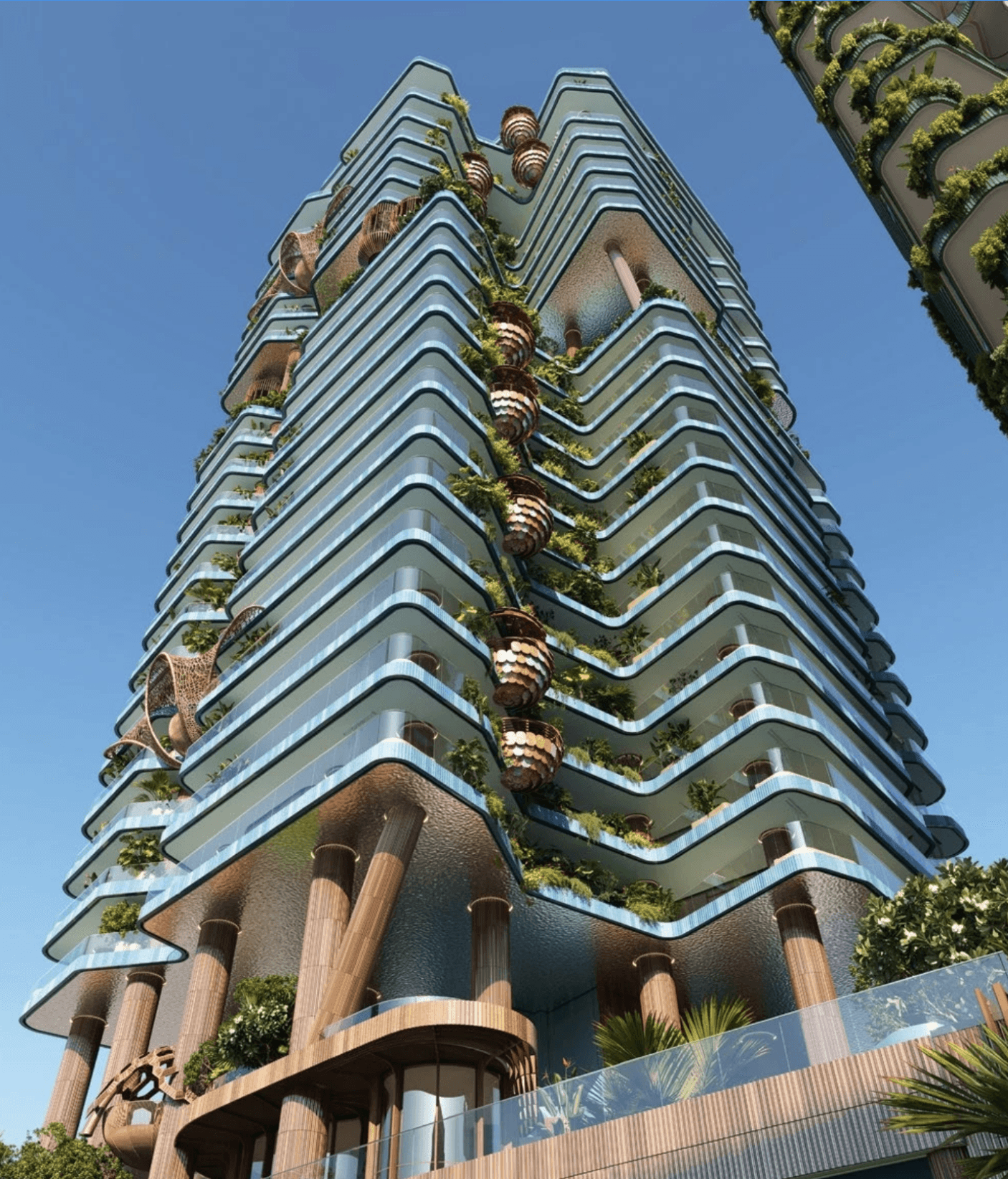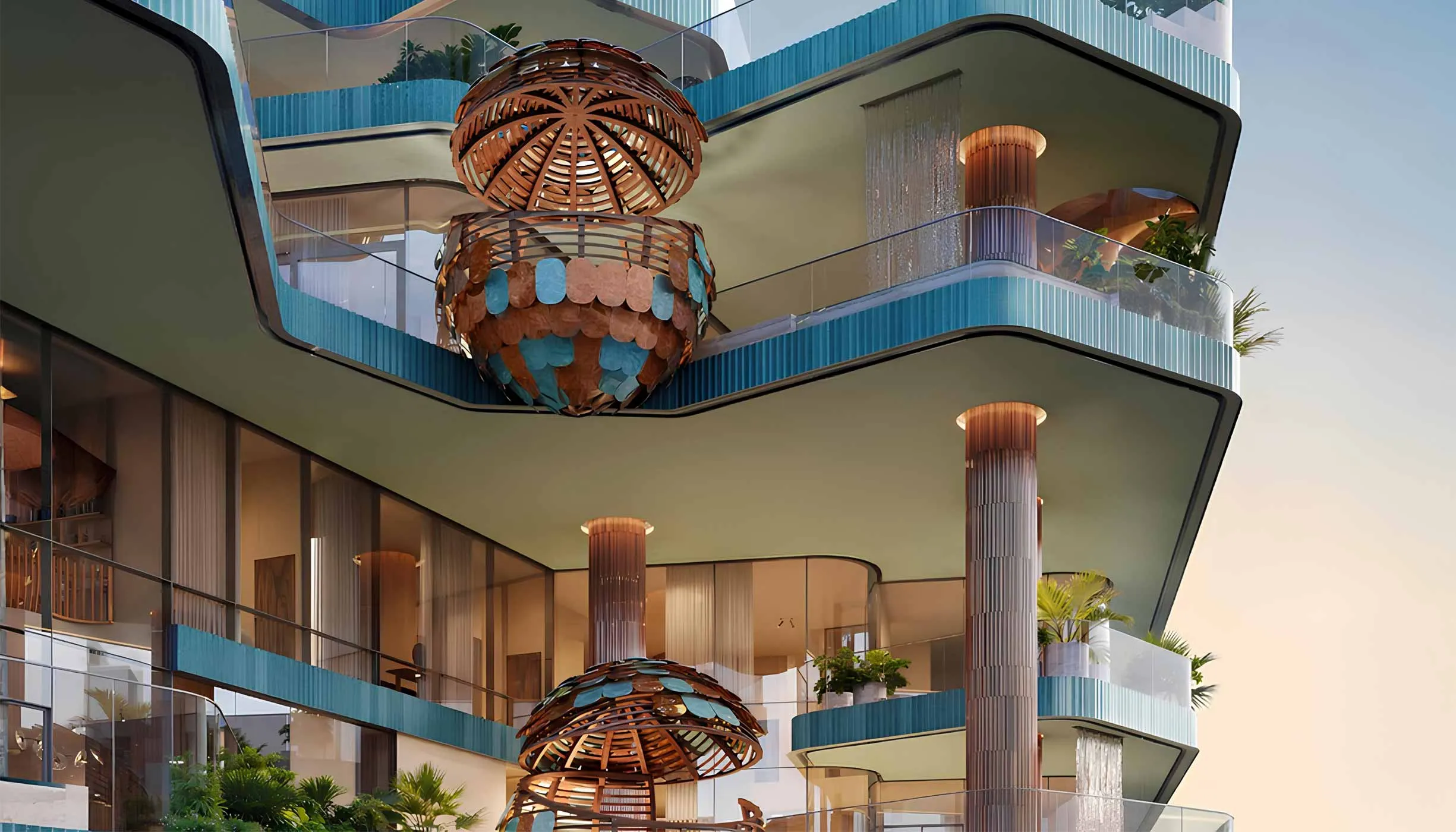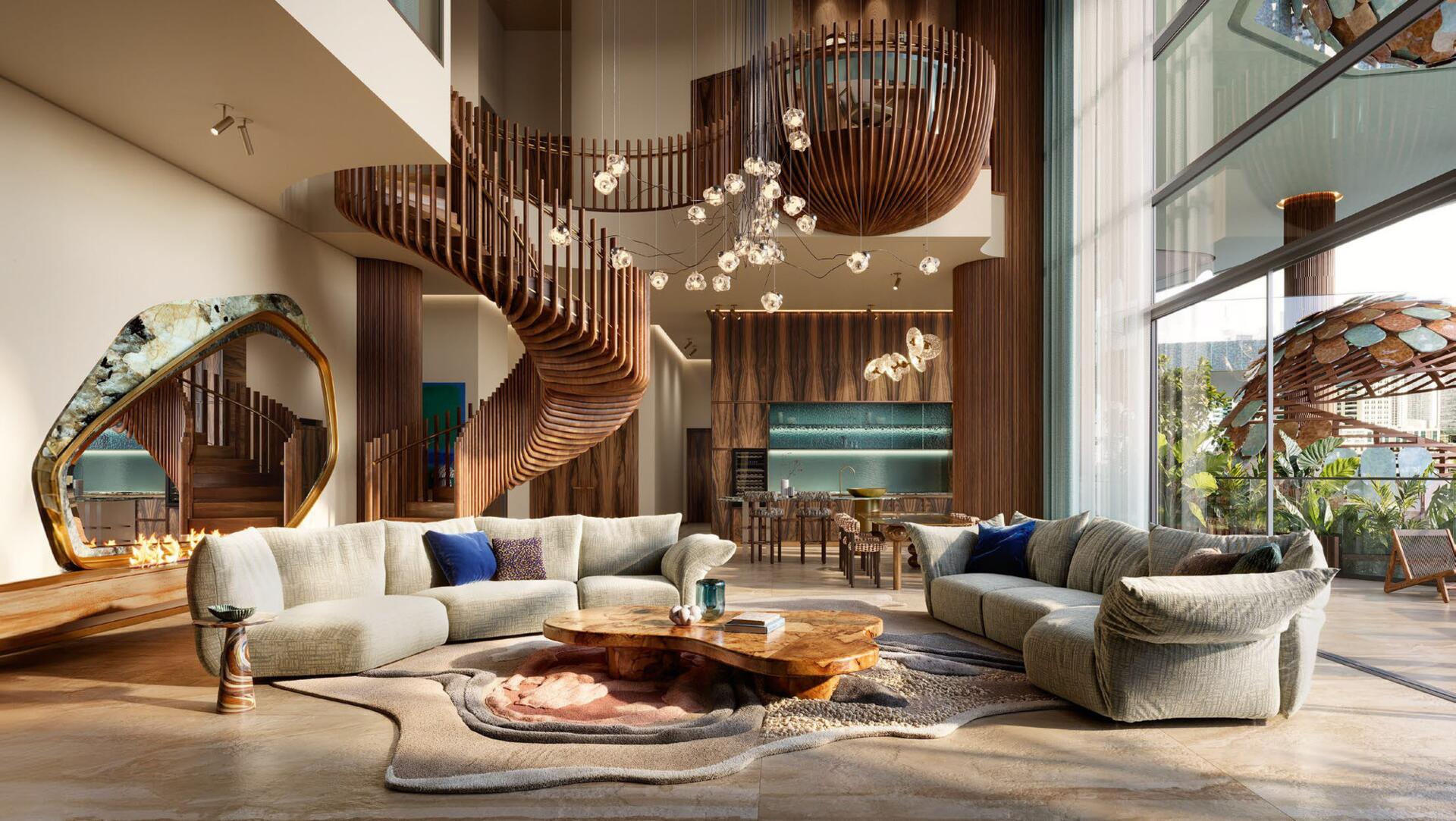 Positioned on the Dubai Water Canal in Business Bay, Eywa is inspired by the sacred Tree of Life and the resilience of mangrove roots. Designed by Zane Tetere-Sulce (OAD) and developed by R.evolution, the project comprises just 65 fully finished residences ranging from 2,185 to 24,756 sq ft. Homes are crafted as natural, toxin-free sanctuaries using Travertine stone, Austrian wood parquet, and Paldao cabinetry, enhanced with more than 21,000 kg of healing crystals, structured living-water systems, MERV-14 purification, EMF shielding, and Vastu-guided layouts.