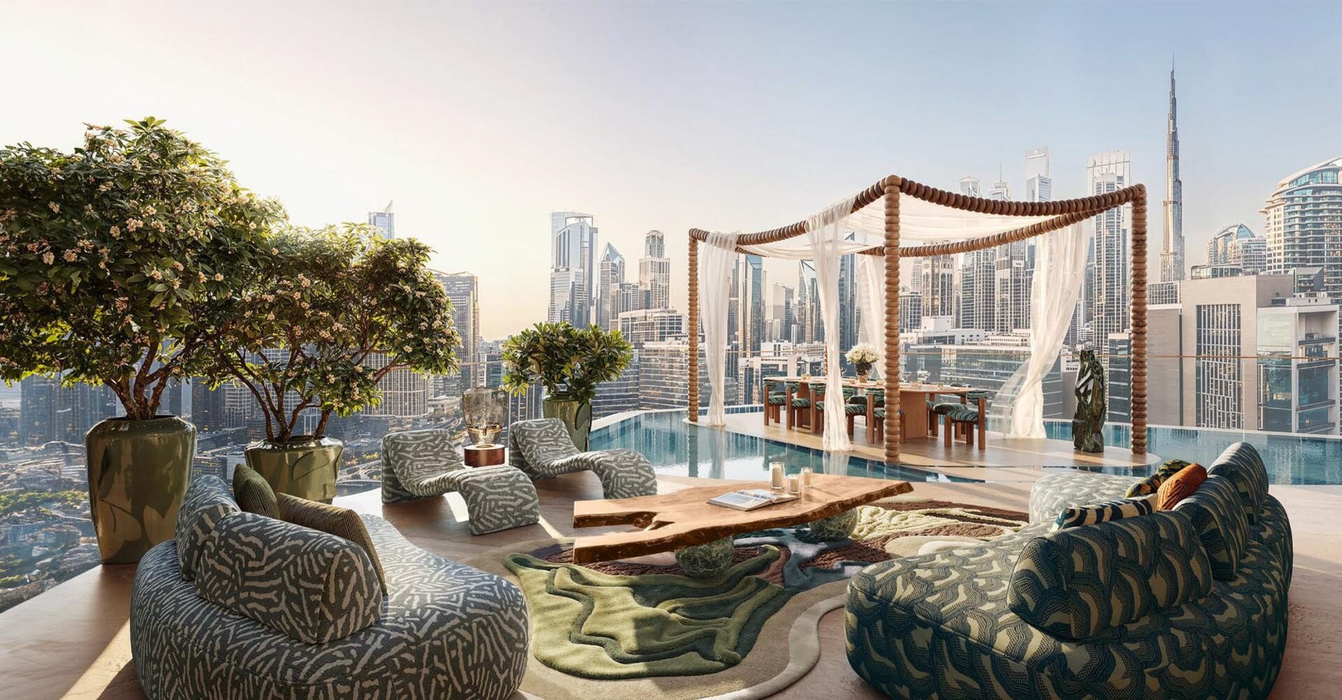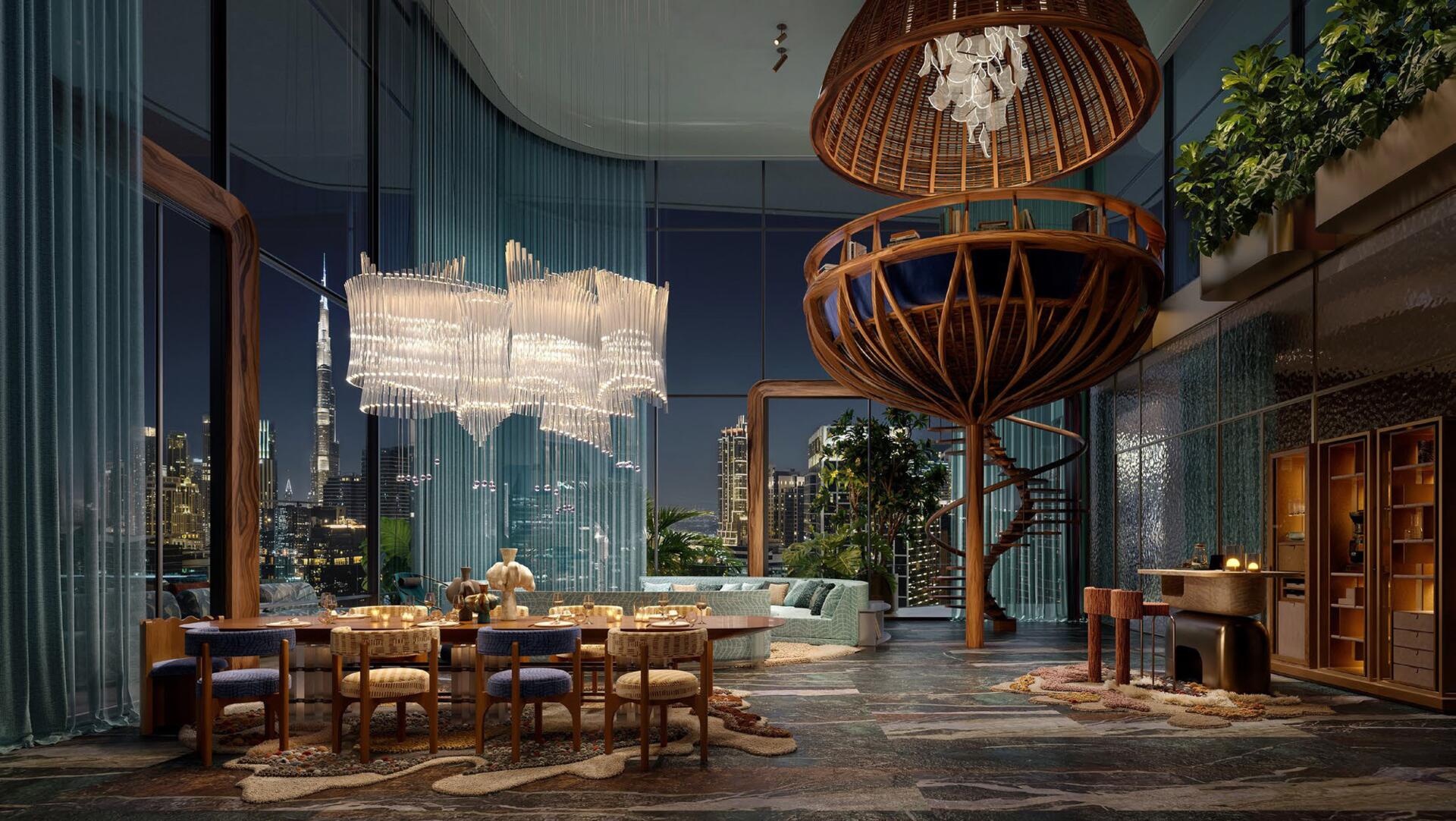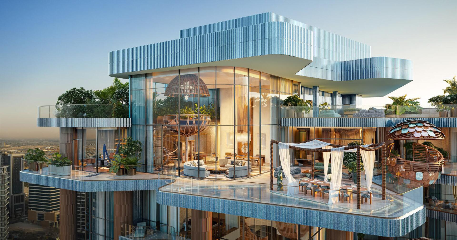 Residences offer ceiling heights up to 7.6 metres, large terraces with pools and greenery, spa-inspired bathrooms, spacious dressing areas, and premium kitchens with Miele and Liebherr appliances (plus secondary Bosch kitchens in select units). Floor-to-ceiling glazing captures views of the Dubai Canal, Burj Khalifa, and Downtown. With its wellness-focused architecture, advanced energy systems, and refined craftsmanship, Eywa sets a new global benchmark for conscious, holistic luxury living.